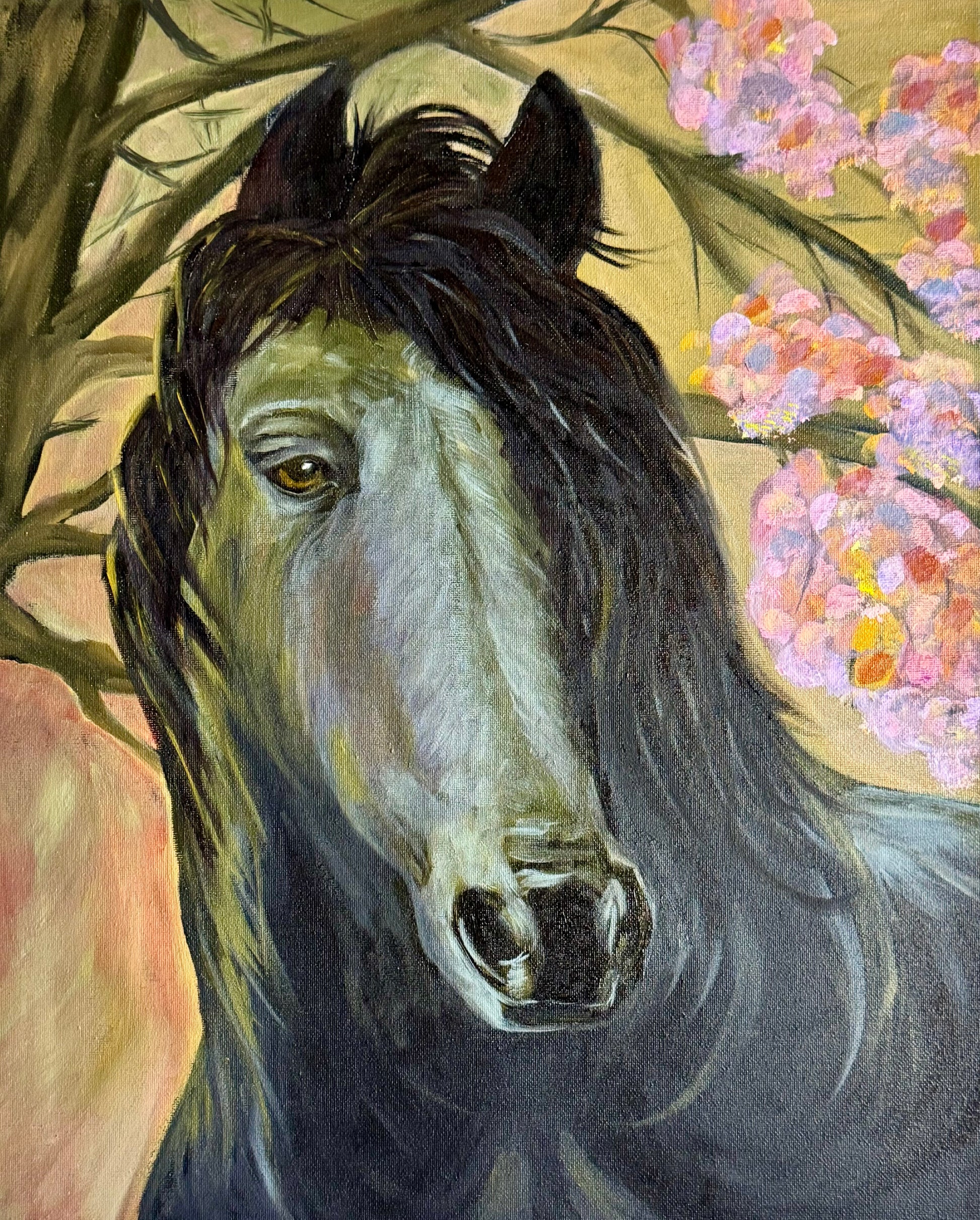 The Spring Majesty is a striking equine portrait that captures the noble spirit and quiet strength of the horse amidst a delicate springtime bloom. This original horse painting blends fine realism with a touch of romantic naturalism, portraying a majestic black-maned steed framed by soft pink cherry blossoms and warm, golden light. The horse’s soulful gaze and flowing mane evoke a sense of freedom, trust, and gentle power—qualities that resonate deeply with equestrian lovers.