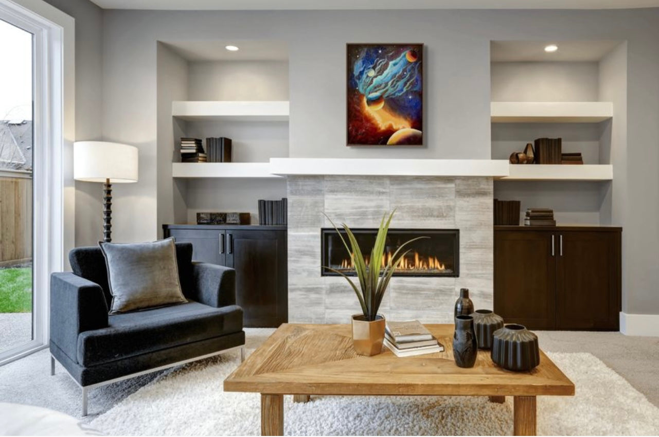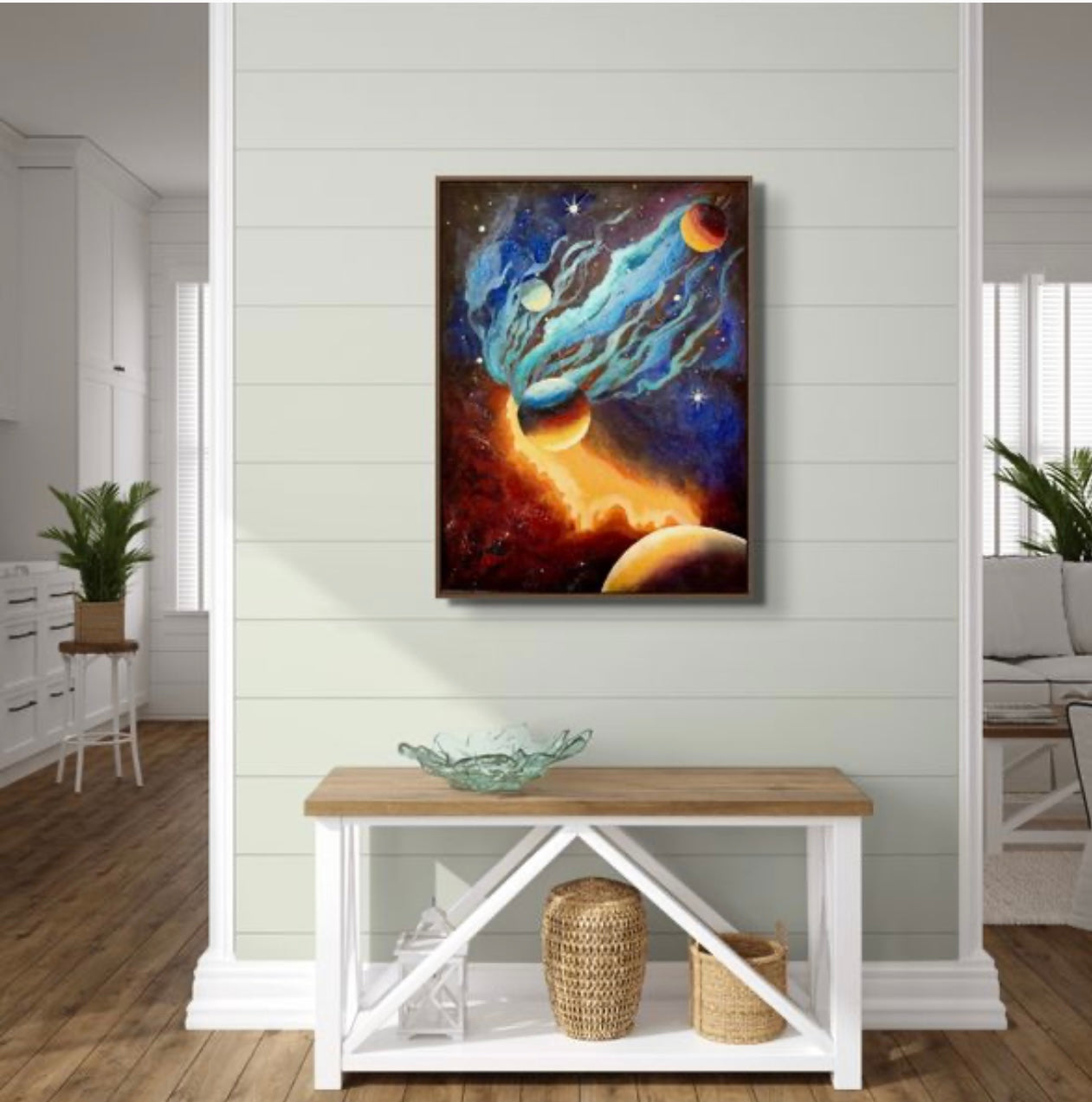“Celestial Awakening” captures the birth and expansion of a cosmic scene, where celestial bodies seem to emerge from a vibrant and mysterious source of energy. The painting is a dynamic portrayal of planets or moons, suspended in space, yet in motion as if awakening to new life or existence. The swirling blue and teal streaks that stretch across the canvas suggest cosmic winds or energetic forces propelling these planets into the vast universe, reminiscent of the early moments of creation.