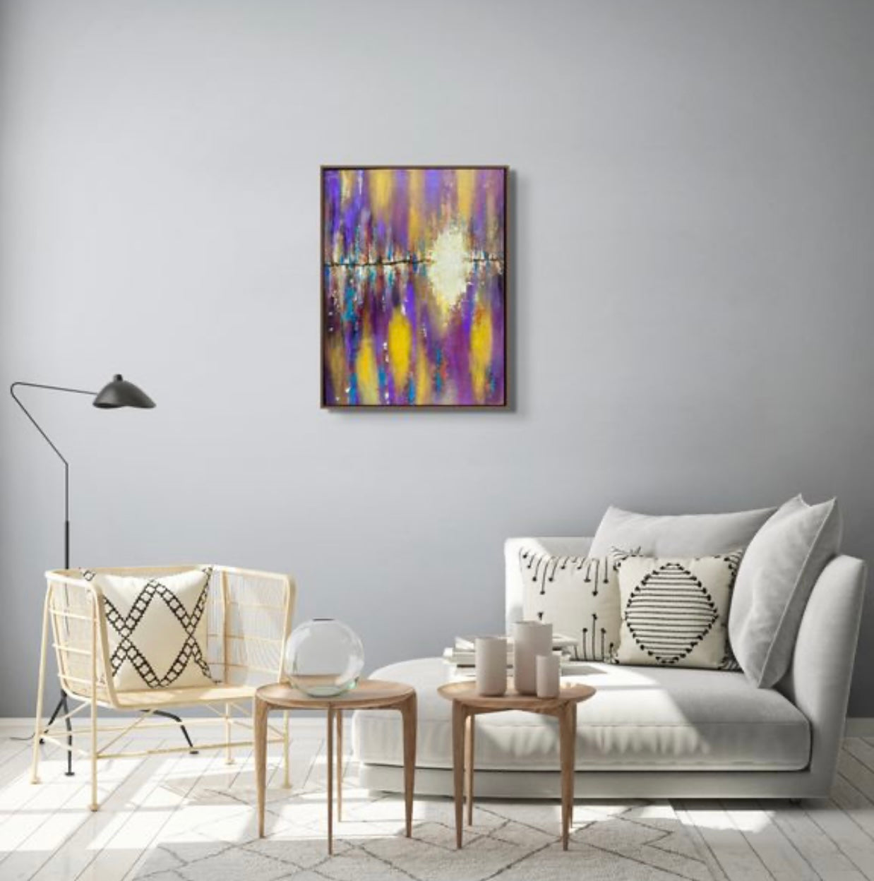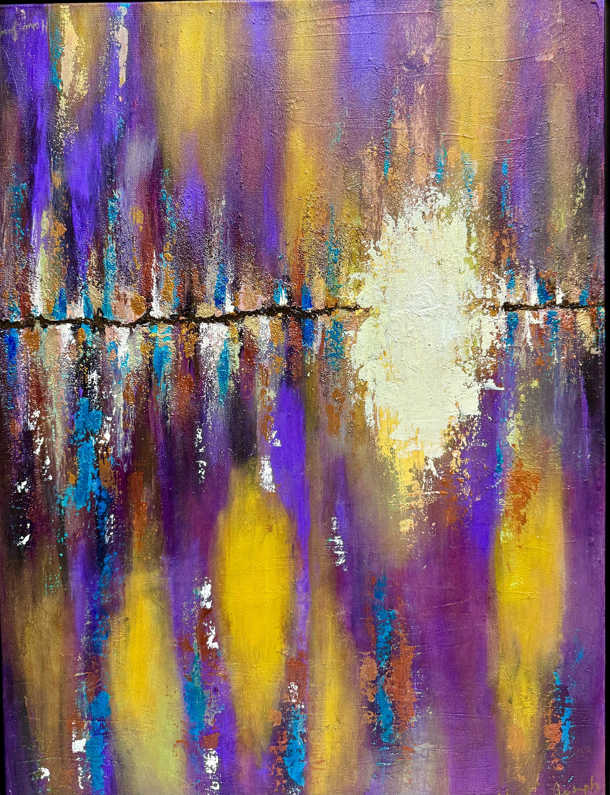 “Distant Illumination” is a captivating abstract painting that masterfully portrays the interplay of light and color. With radiant golden hues and deep purples converging across the canvas, the artwork evokes a distant light breaking through shadows, illuminating its surroundings with warmth and vibrance. Vertical streaks of yellow and violet, a bold black line cutting across the middle, and textured layers add striking contrast and tactile quality, inviting viewers to engage with the piece visually and physically.