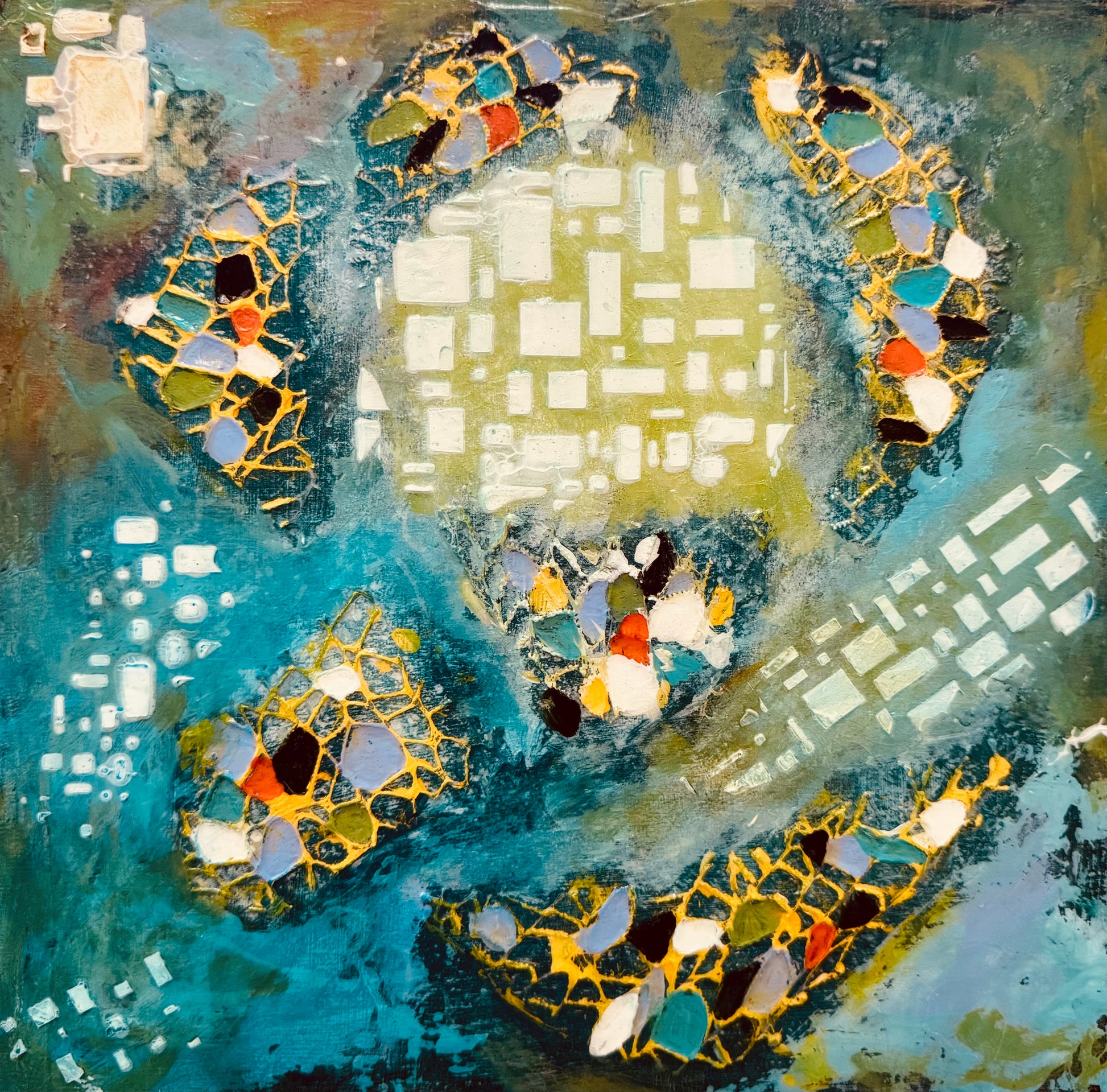 Acrylic and mixed media on canvas, 12"x12" on natural wood floater frame.