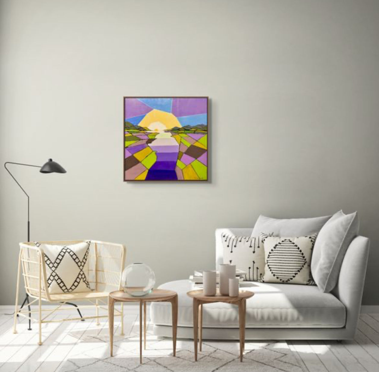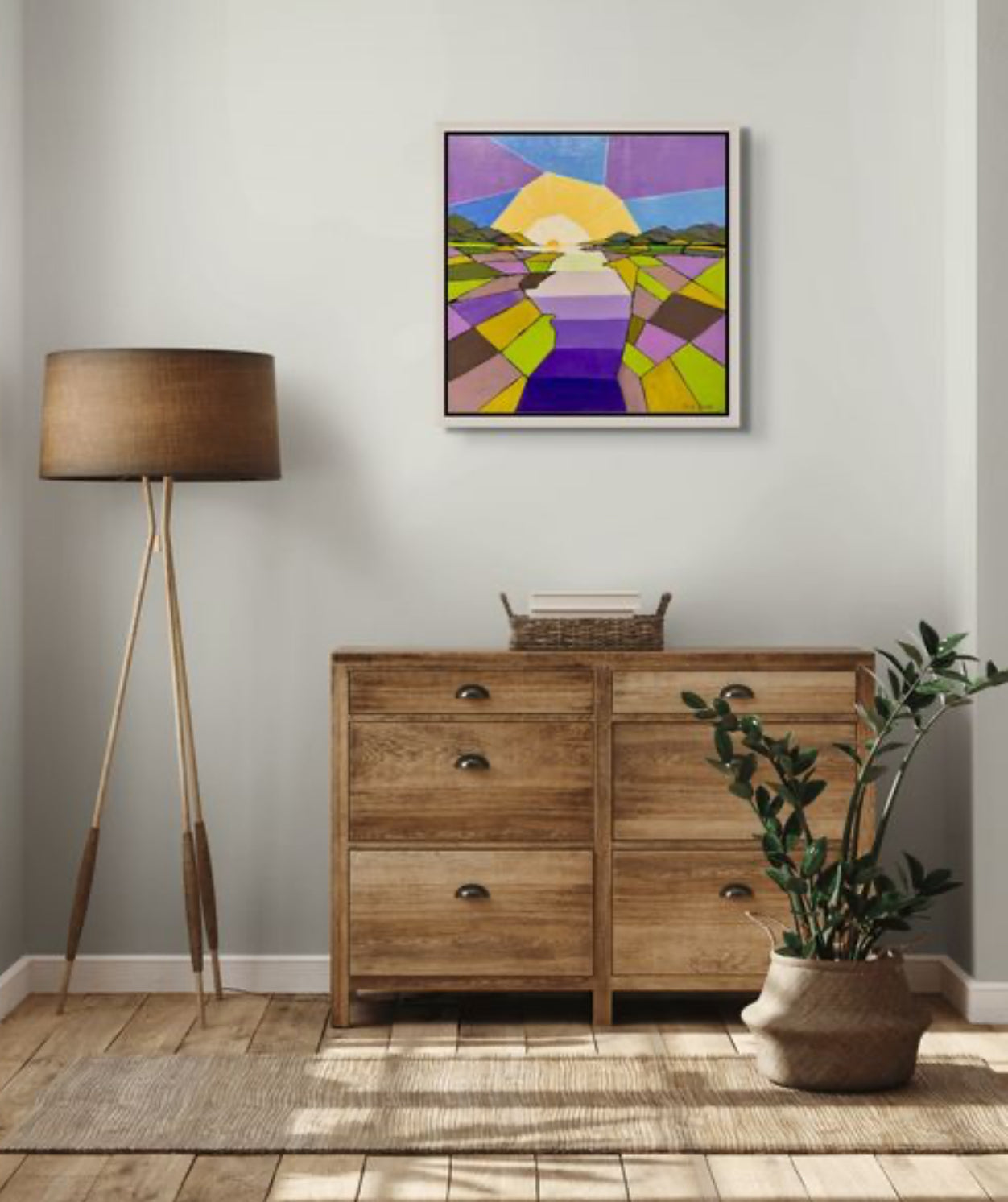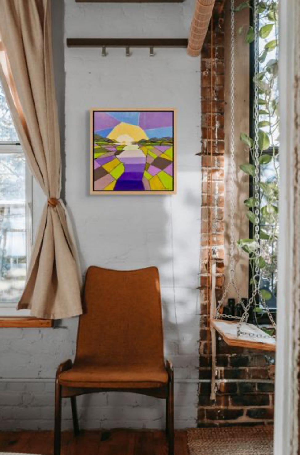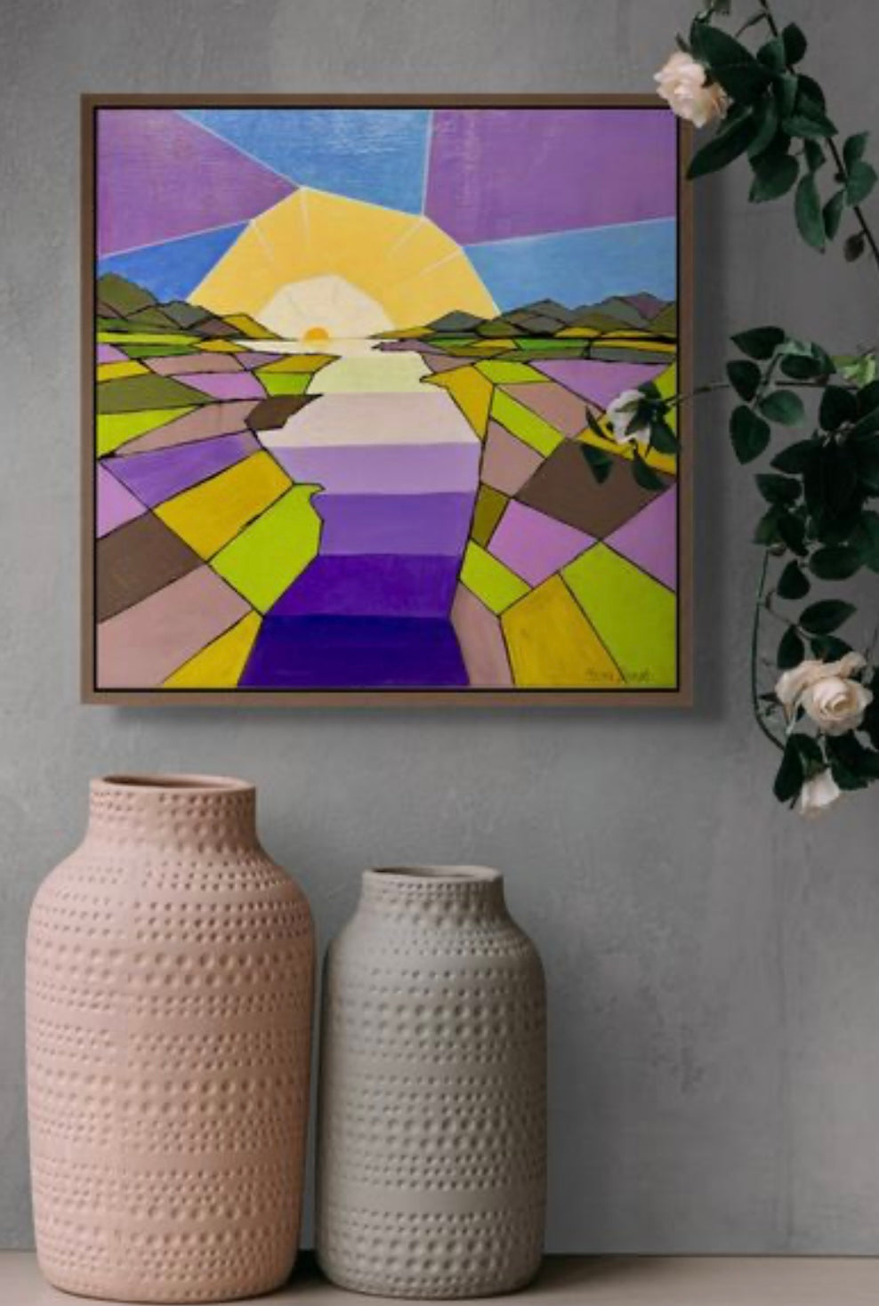 “Morning Glory” is an abstract landscape that celebrates the beauty and serenity of the golden dawn over a mosaic of purple, green, and yellow fields. The glowing sun creates a pathway of light that symbolizes hope, renewal, and endless possibility.