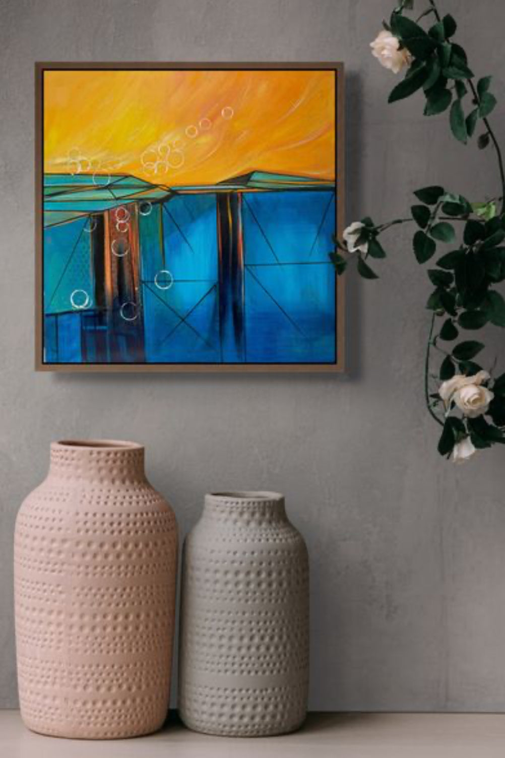 "Ocean Blaze" is an abstract that captures the vibrant clash between the tranquility of the ocean and the fierce energy of the sun. This artwork features deep shades of blue, layered with dynamic geometric shapes, that evoke the vastness and depth of oceanic landscapes. Rising above, a fiery yellow-orange sky contrasts against the cool tones below, symbolizing the unstoppable force of nature as day meets night in a blaze of color. The white circular elements drift across the composition, resembling bubbles or energy spheres, enhancing the sense of movement and life within the artwork.