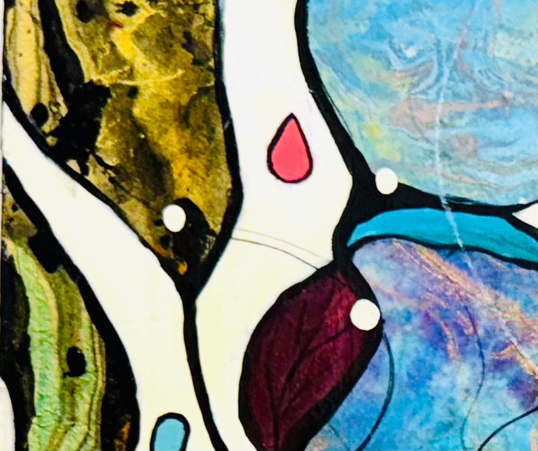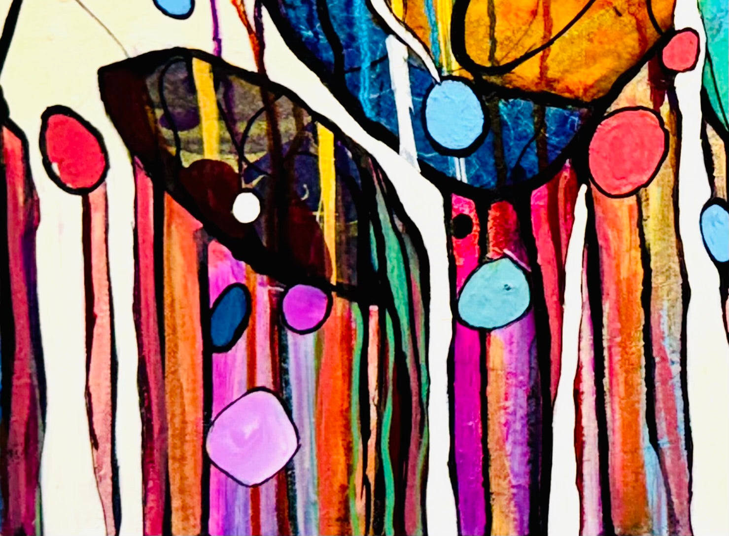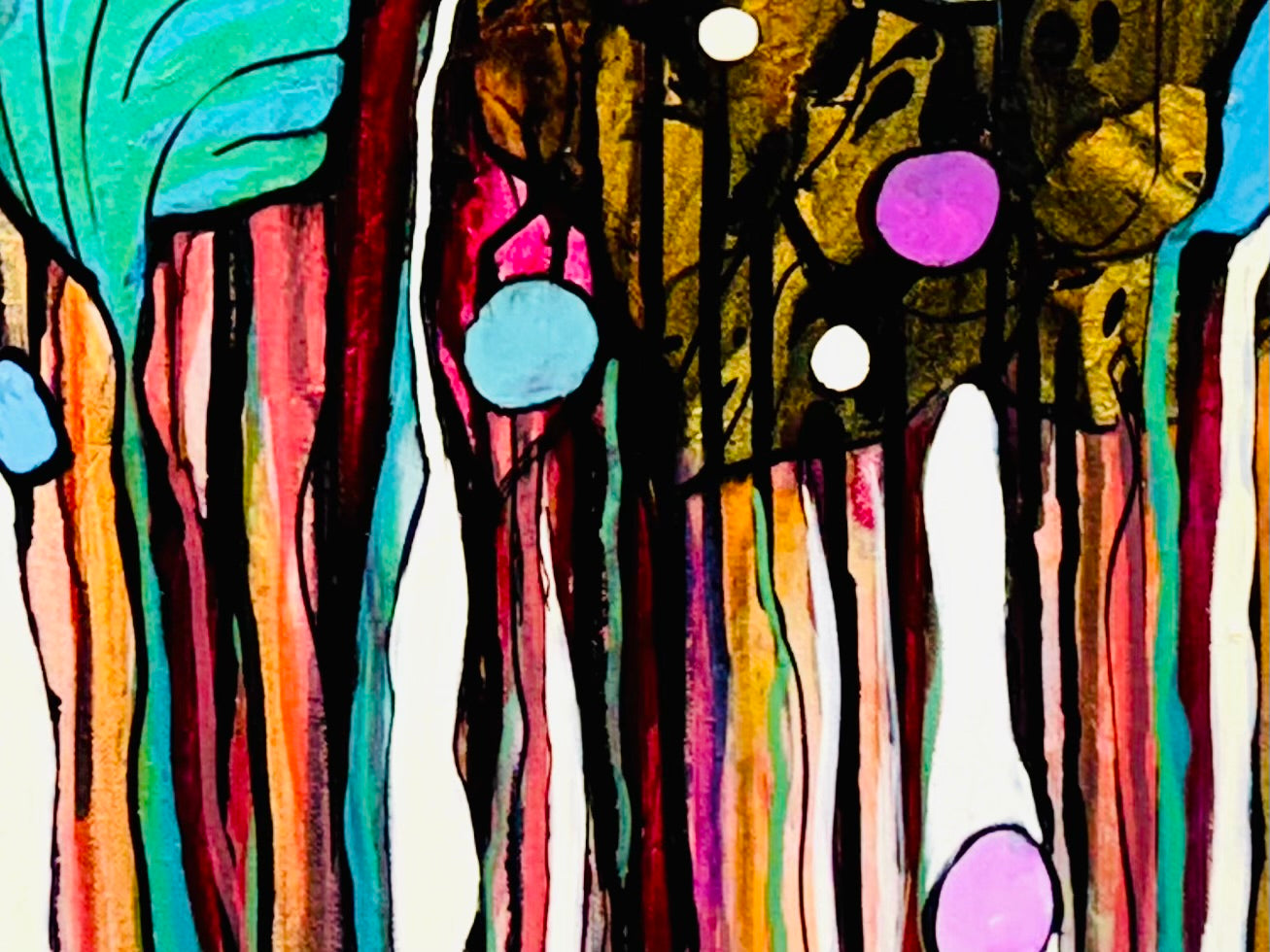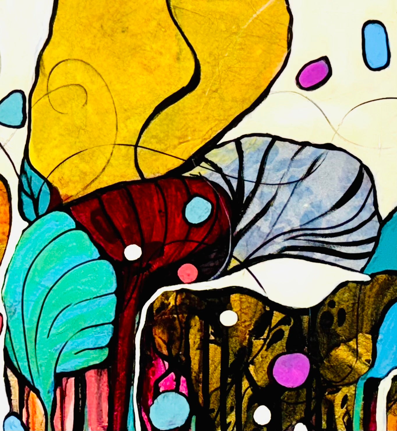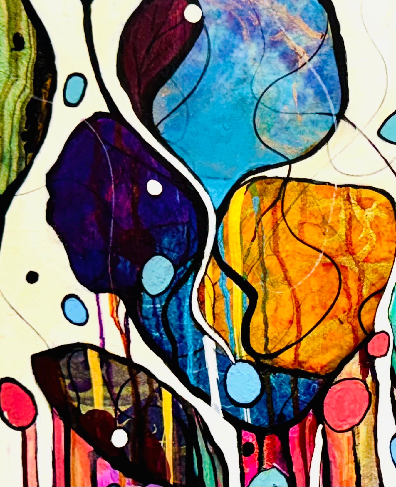 This contemporary abstract expressionist painting weaves together vibrant color, flowing textures, and organic forms with bold layers of gold, turquoise, violet, and crimson rise like dream-petals from cascading roots, creating a striking balance between grounding and upliftment. “Rooted Dreams” invites viewers to reflect on the harmony between stability and imagination.