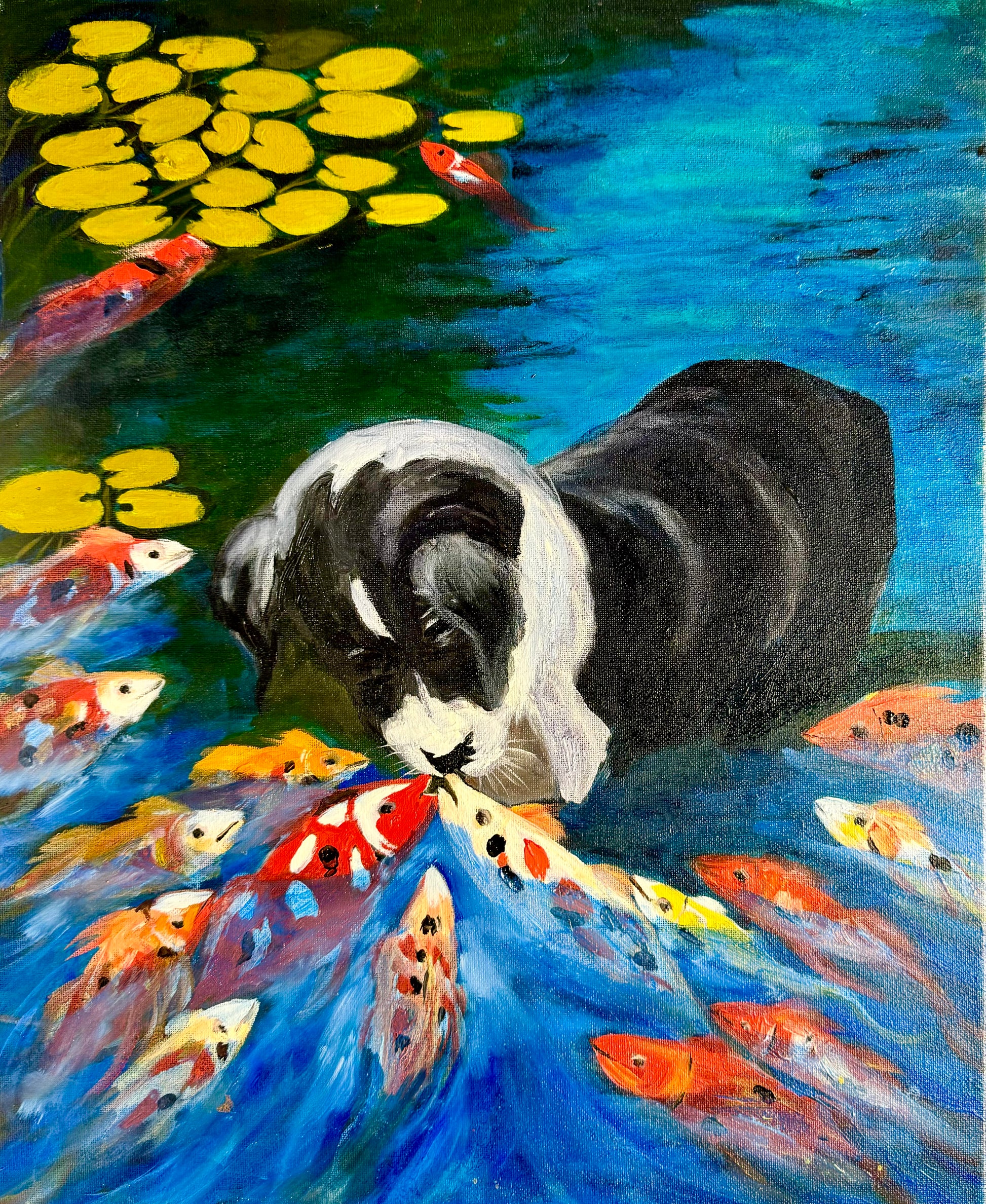Surrounded by rippling blues and golden lily pads, the koi shimmer in brilliant orange, red, yellow, and white, reflecting the diversity of life and the beauty of coexistence. The pup’s wide-eyed wonder evokes a childlike purity—reminding us of the love that comes before division, before bias.