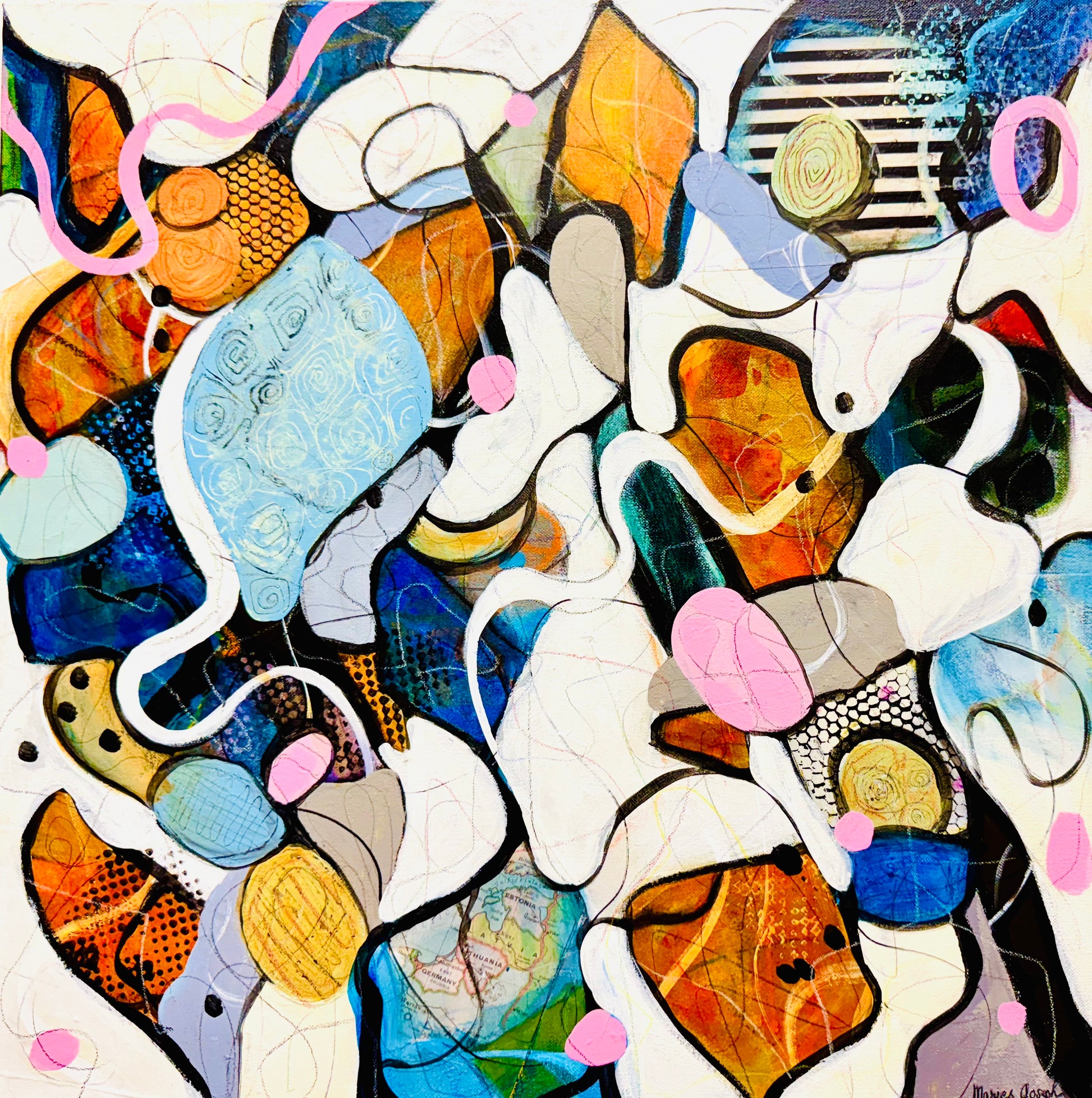“The Layers and Currents of Becoming” is a dynamic acrylic and mixed media abstract painting that captures the vibrant energy of transformation and self-evolution. This richly textured piece bursts with movement, featuring sweeping curves, layered forms, and flowing lines that evoke a sense of inner and outer motion. Bold oranges, deep blues, and soft pinks collide with organic shapes and rhythmic patterns, creating a visual symphony of layered emotions and unfolding possibilities.