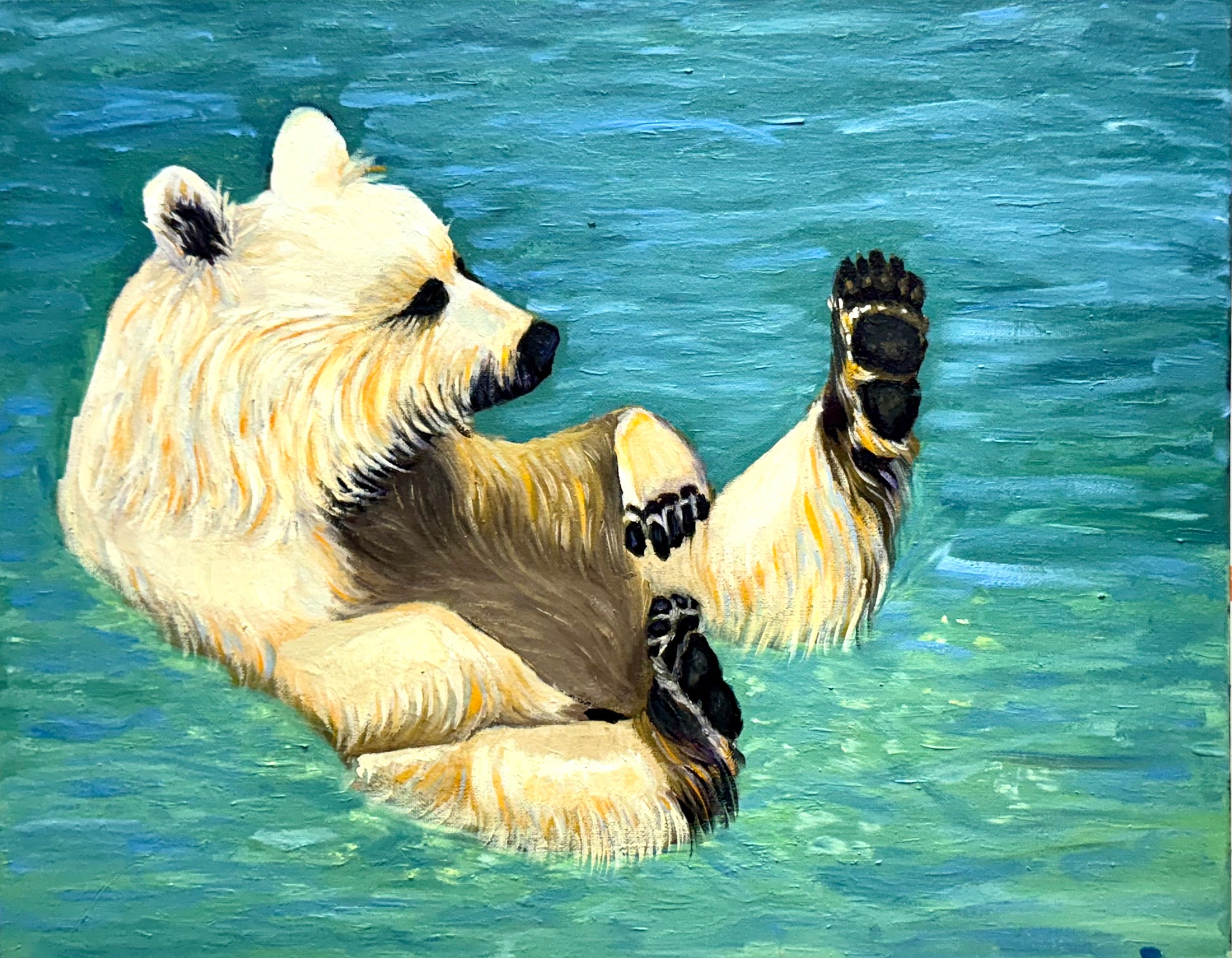 Immerse yourself in the joyful tranquility of Playful Pause, a captivating oil painting that features a charming polar bear basking in the serenity of cool blue waters. Rendered in rich, expressive brushstrokes, the bear floats with an endearing, almost humanlike ease—its soft, creamy fur accented with sun-kissed golden tones and contrasting dark paws that draw the viewer’s eye. The vivid, layered background evokes the gentle motion of water, blending turquoise and aquamarine hues to create a refreshing sense of depth and calm.