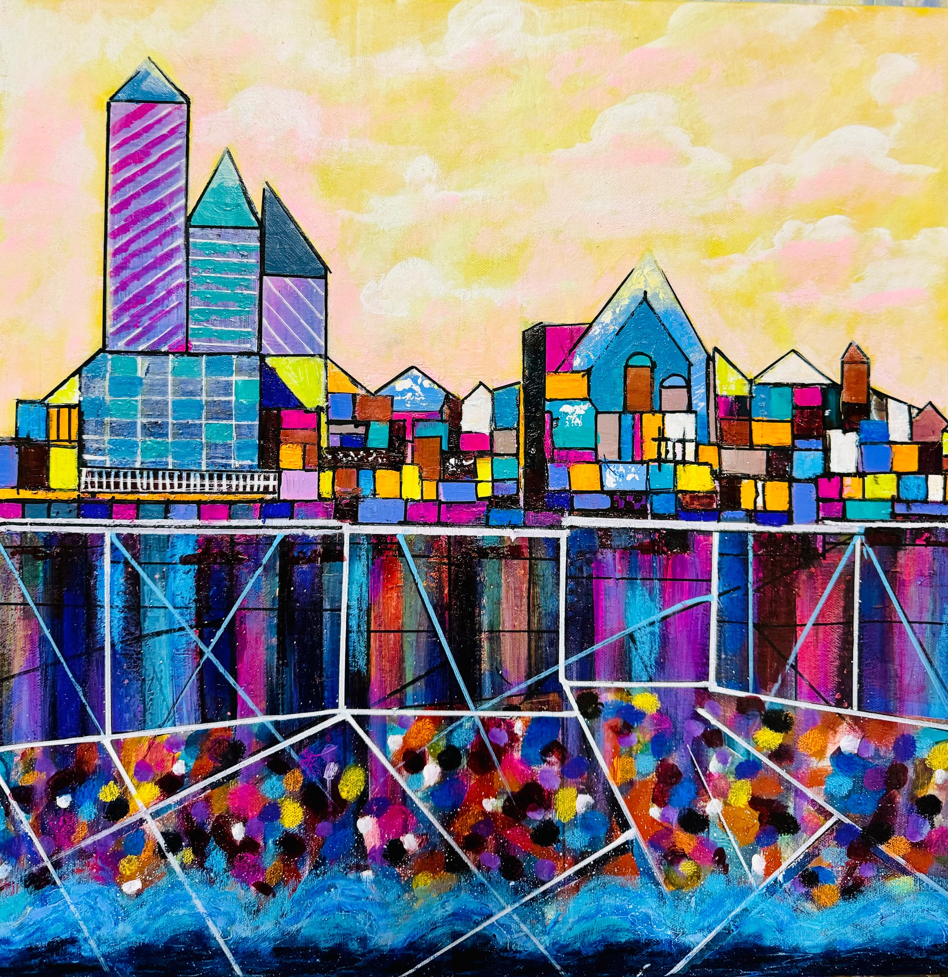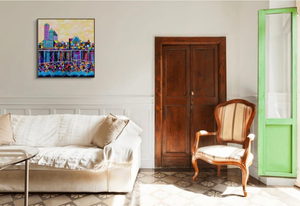 “Urban Kaleidoscope” is a vibrant and captivating artwork that reimagines the cityscape through a mesmerizing fusion of color and geometry. This piece portrays an abstract skyline where bold architectural shapes and radiant hues blend seamlessly, creating a reflective urban landscape that feels both familiar and dreamlike. What sets “Urban Kaleidoscope” apart is its exploration beneath the surface, extending down to reveal the hidden depths below the city, reaching the water plate. This layered perspective offers a glimpse into the unseen, where colorful reflections and intricate patterns evoke the mystery and energy that lie beneath city life. Perfect for those who appreciate modern art with a touch of surrealism, this artwork adds a splash of color and sophistication to any space. Embrace the spirit of the city with “Urban Kaleidoscope” and let its prismatic beauty elevate your surroundings, from skyline to depths.