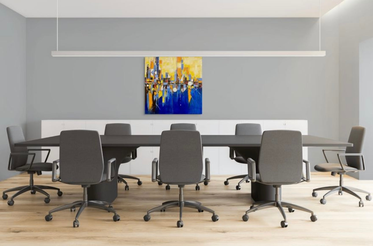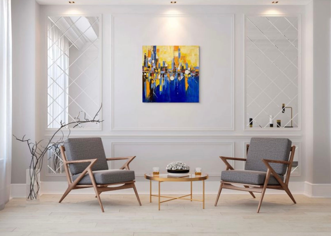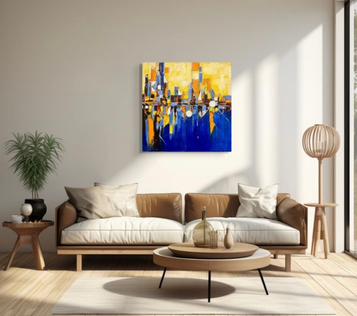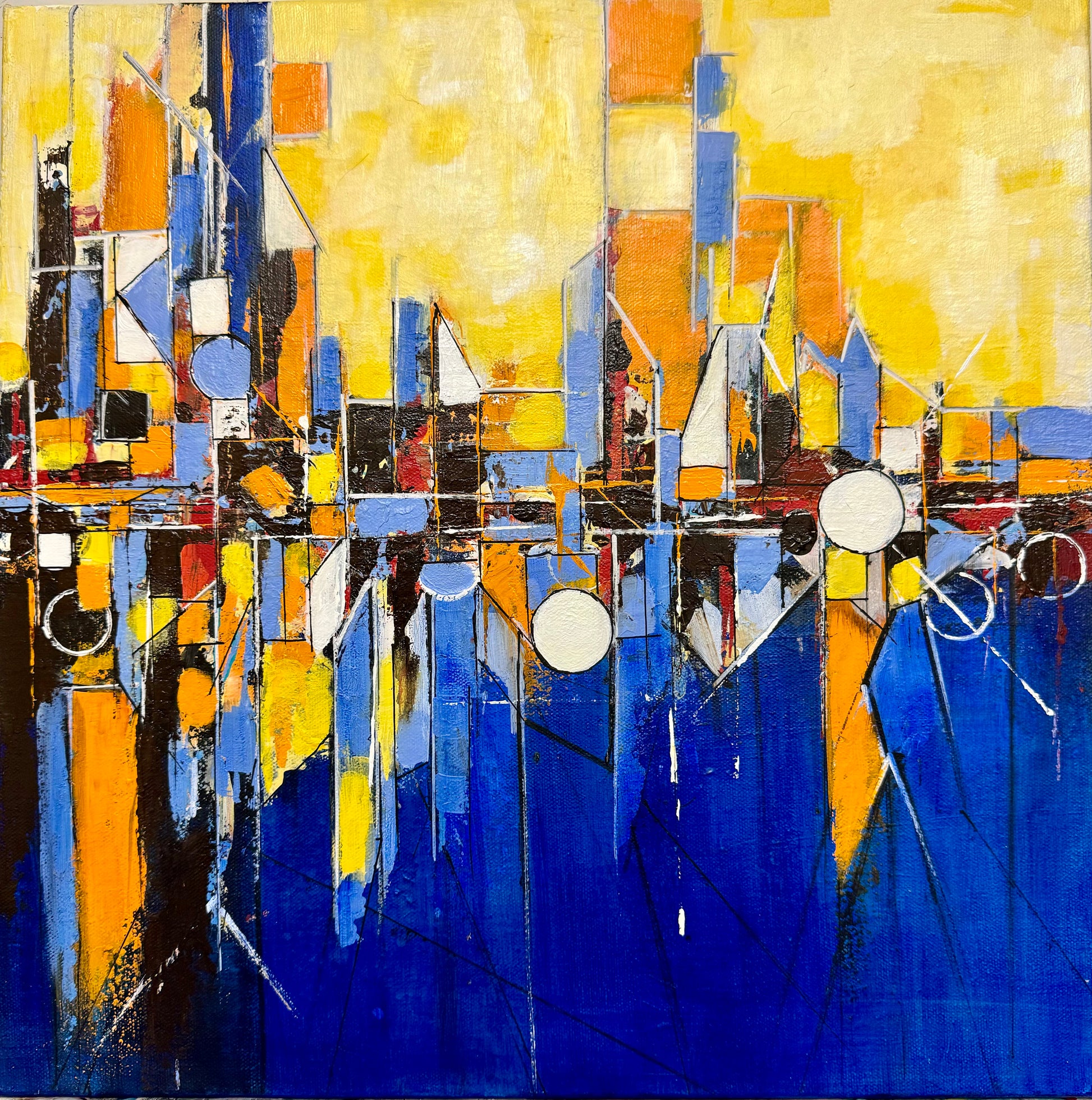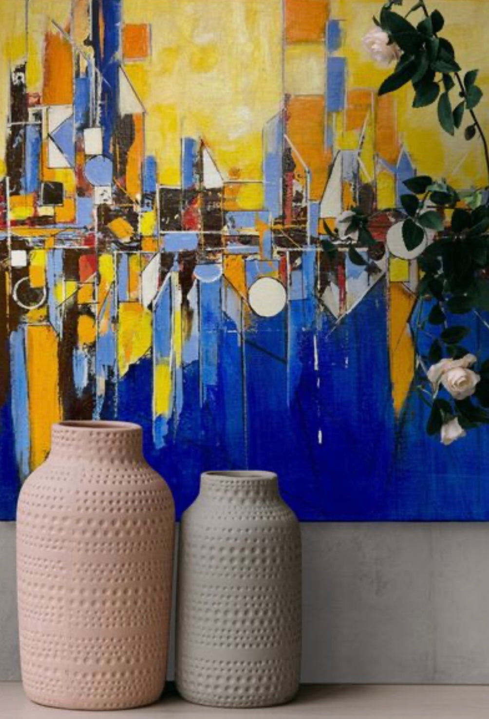 "Urban Symphony” is an abstract painting that captures the dynamic energy of city life through vibrant colors and structured forms. The composition features interlocking shapes in shades of gold, blue, and red, evoking the rhythm and movement of a bustling metropolis. The interplay of warm and cool tones creates a harmonious balance, drawing the viewer into a mesmerizing visual experience. This piece is a testament to the artist’s ability to translate the complexities of urban environments into a captivating abstract expression.