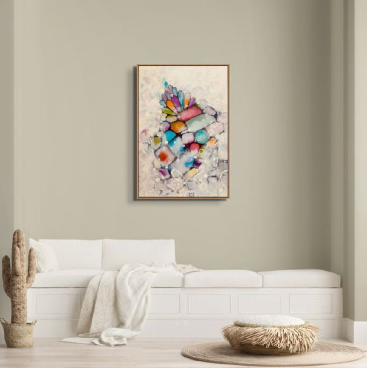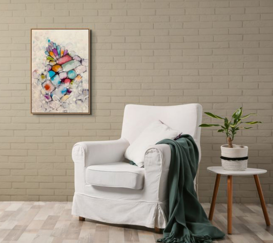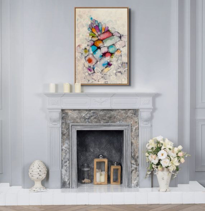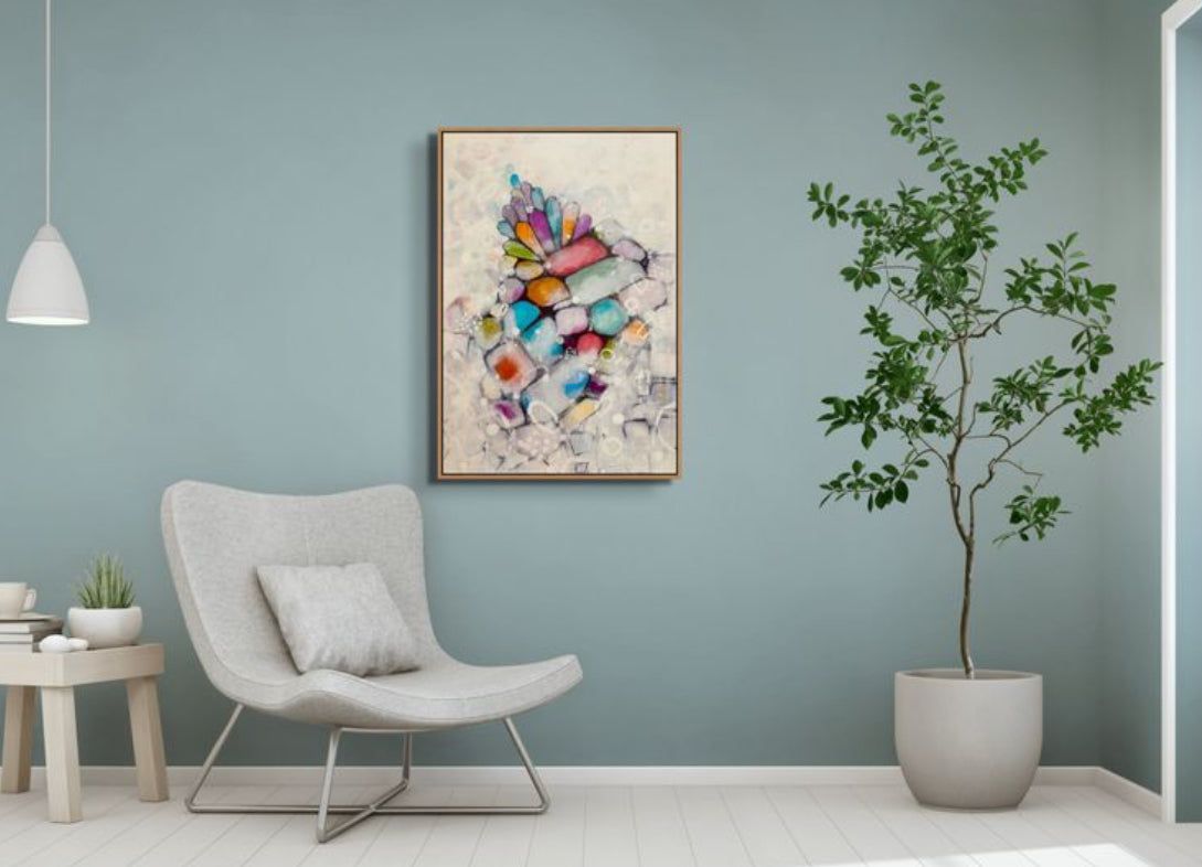 Step into the captivating world of “Veiled Spectrum,” an abstract composition that seamlessly blends vibrancy with subtlety. This piece embodies the delicate balance between structure and fluidity, where radiant hues of red, blue, orange, purple, and green emerge from a soft, ethereal background as if peeking through a translucent veil of mystery. The intricate interplay of geometric and organic forms adds a sense of movement and depth, inviting the viewer to explore the hidden layers beneath the surface.Its enigmatic interplay of shadow and light creates a dynamic visual journey, inviting viewers to explore layers of meaning hidden beneath a mesmerizing cascade of hues.